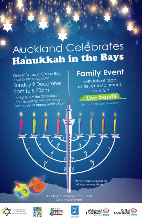 Join the Jewish Community and Auckland public in celebrating Hanukkah, the Jewish Festival of Lights, on Sunday 9th September, from 5 pm until 8:30 pm. This is a free (gold coin donation) family public event. Expect live bands, children activities, food vendors and other booths, entertainment, a raffle, and the main event – lighting the Hanukkiah at sunset. Bring cash. Zero waste and zero alcohol event.