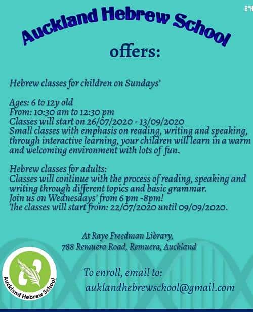 Auckland Hebrew School Term 3 Hebrew classes for children on Sundays from 26 July, and adults on Wednesdays from 22 July