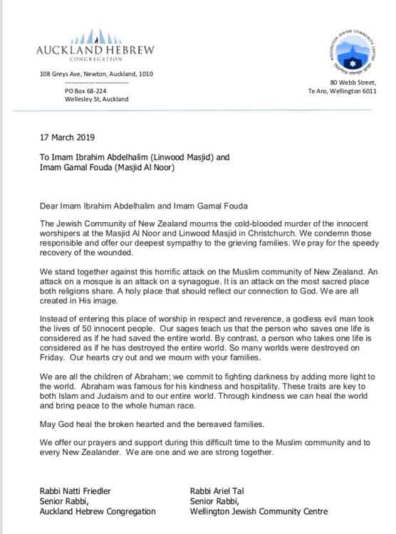 Letter from NZ Rabbis to Christchurch Imans A letter from Rabbis Natti Friedler and Ariel Tal to the Imams of the attacked mosques.