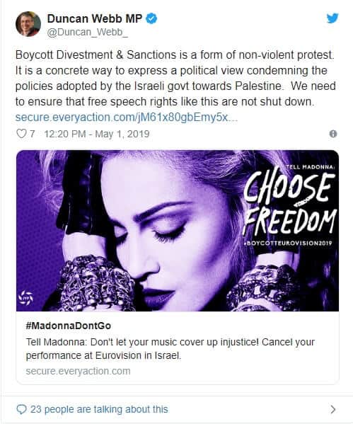 Secondly, his tweet was in support of preventing a musician from playing at an event. His tweet was, therefore seeking to stifle freedom of expression – an expression that could help bring people together, in fact. The hypocrisy should be clear to anyone who takes a moment to consider it.