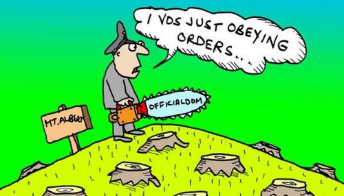 The NZ Herald’s comic, drawn by veteran cartoonist Peter Bromhead, depicts a Nazi officer with a chainsaw surrounded by tree stumps. It reads: “I vos just obeying orders”, the chainsaw marked with “officialdom” and a signpost reading “Mt Albert”.
