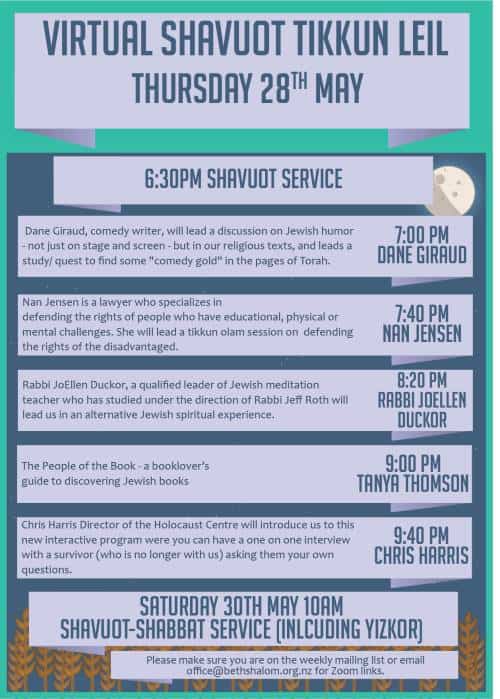 Virtual Shavuot Tikkun Leil Please make sure you are on the Beth Shalom weekly mailing list or email office@bethshalom.org.nz for Zoom links.