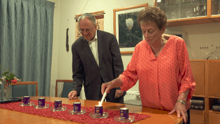 [Inge Woolf QSA and Steven Sedley MNZM, Founding Director and Founding Chair (respectively) of the Holocaust Centre of New Zealand, light 6 memorial candles during the ZFNZ’s national online 2020 Yom HaShoah service to remember the 6 million Jews murdered by the Nazis and their collaborators during the Shoah.]